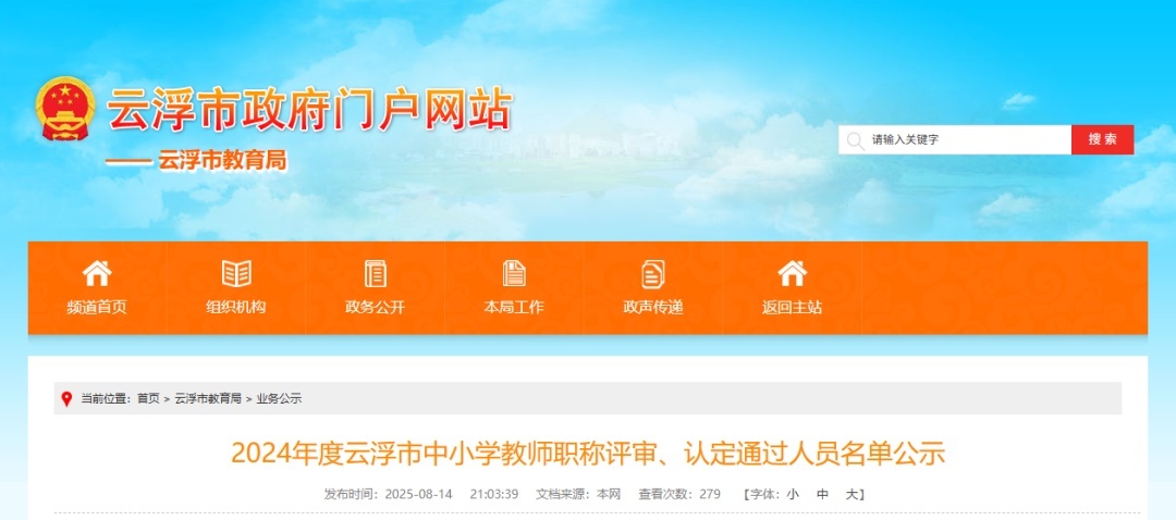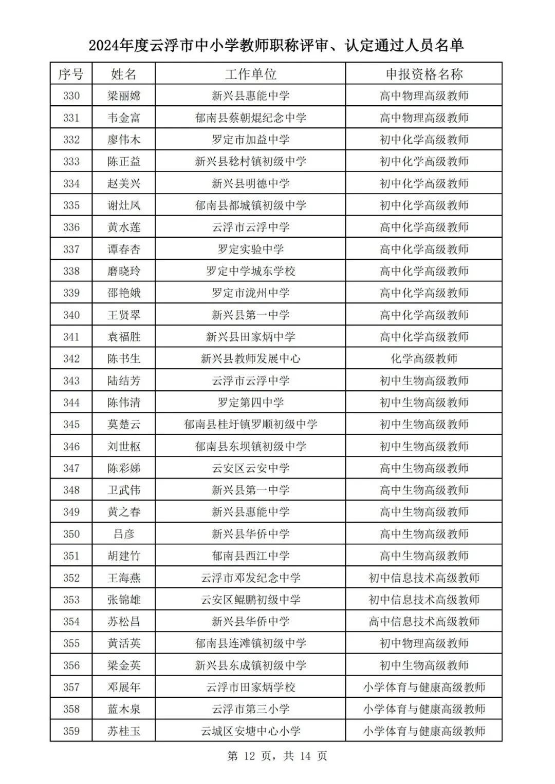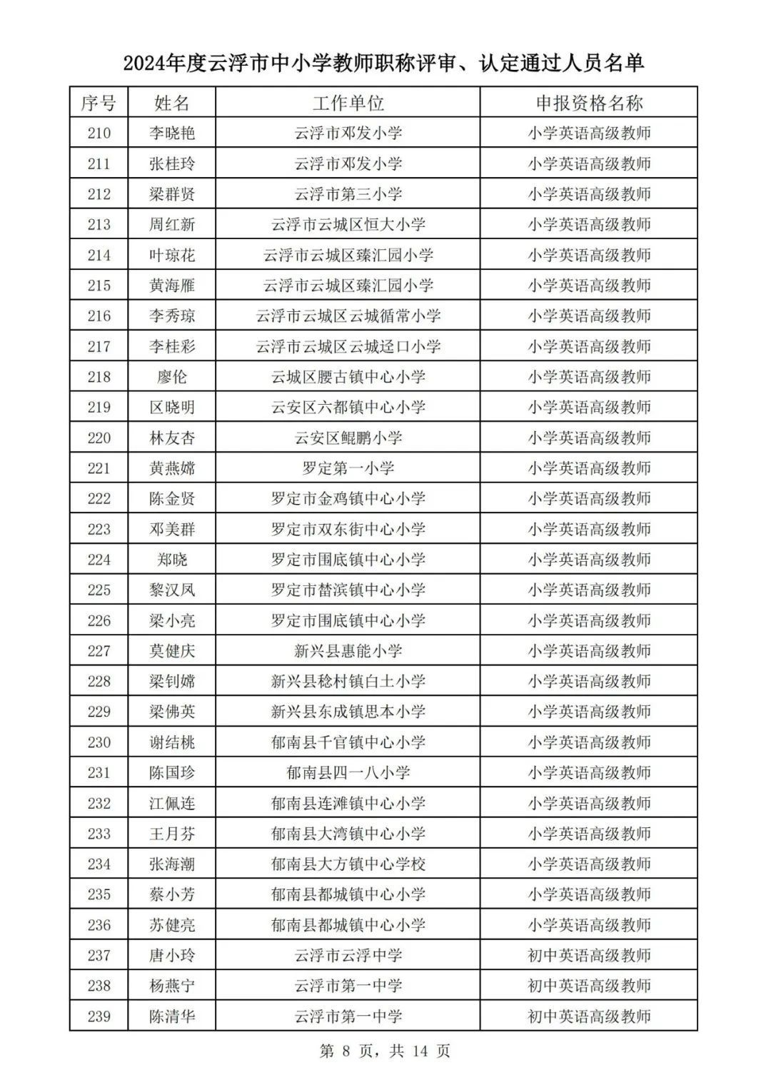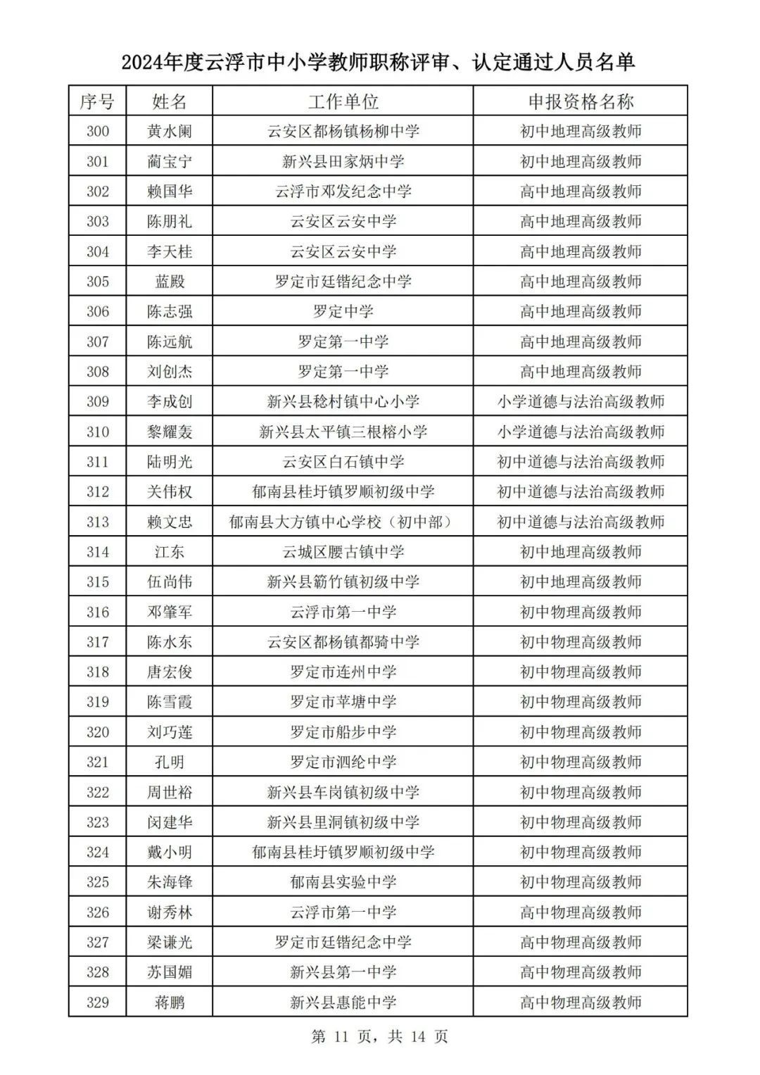 经云浮市中小学高级教师职称评审委员会评审,下列人员通过中小学教师职称高、中、初级评审或认定,现予公示。公示时间从2025年8月15日至21日止。若对通过人员有异议,请电话或书面形式向市教育局(人事科)或其所在单位或上级教育主管部门的人事部门或纪检监察部门反映。以个人名义反映的应签署或自报本人真实姓名,并留下联系电话;以单位名义反映的应加盖本单位印章。反映公示对象的情况和问题,应坚持实事求是的原则,不得借机诽谤和诬告。