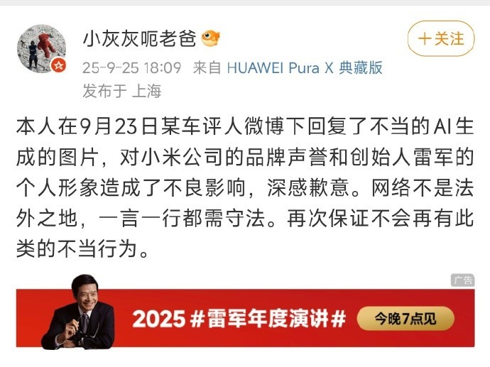 事件发生后盈亚配资,涉事网友于9月25日公开发布道歉声明,承认在车评人微博下的不当行为,表示对小米公司品牌声誉和创始人雷军个人形象造成不良影响深感歉意,并强调"网络不是法外之地,一言一行都需守法",保证“不会再有此类的不当行为。”