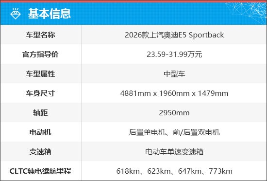 奥迪E5 Sportback共推出4款车型,售价23.59-31.99万元。新车命名中的“E”代表纯电驱动,“5”则对应中型车级别。此外,官方希望通过“AUDI”字母标的新能源产品,给到消费者可靠、安全、突破、创新的感觉。