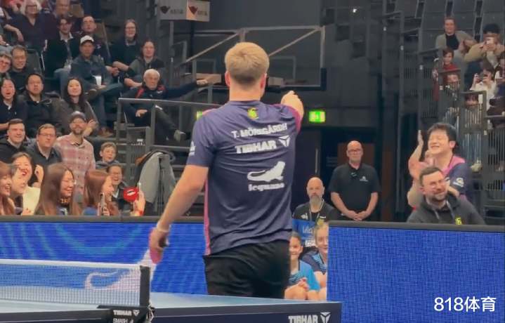 当队友莫雷加德在比赛中打出一记高难度得分球,看上去是在致敬樊振东的反手抽直线,立即转身指向场边观赛的樊振东,用调皮的眼神和手势示意:“快夸我!”表情充满期待。